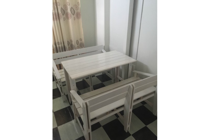 - Mô tả: bộ bàn ghế quán cafe thanh lý, sơn trắng tinh tế trông cực đẹp, chất liệu bằng gỗ thông sấy đã qua sử lý chống mối mọt. Bộ gồm 2 ghế dài + 1 bàn. Khung ghế gỗ đôi (có tay 2 bên) và bàn gỗ được đóng rất chắc chắn, chịu lực cao. Không bị lung lay hay ọp ẹp nhưng một số nơi thanh lý khác.