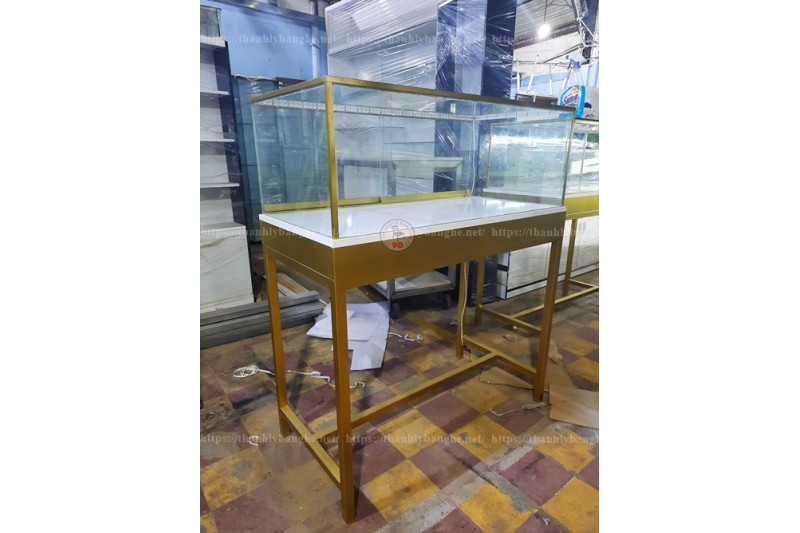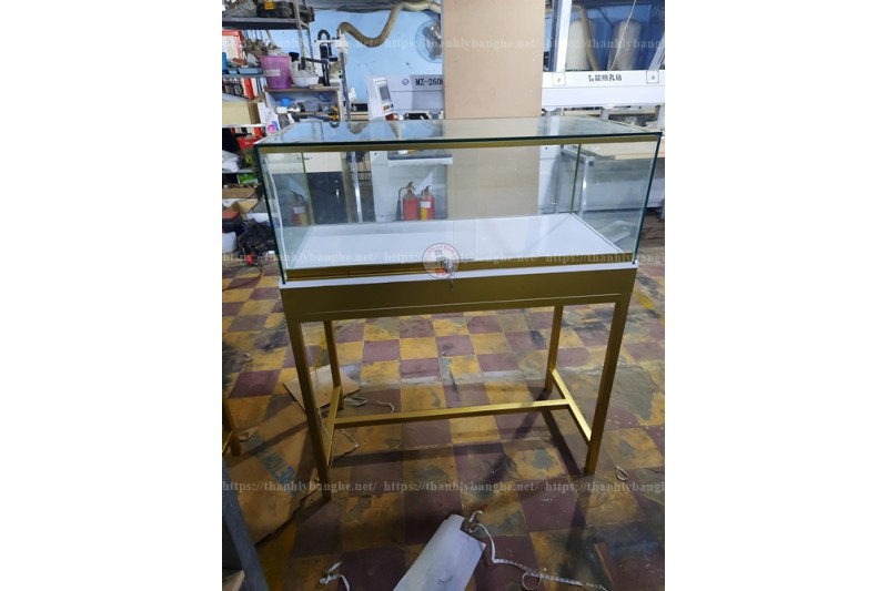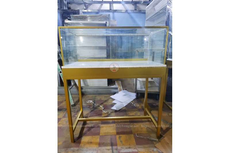 - Tủ kính trưng mỹ phẩm, trang sức, được làm bằng khung sắt sơn vàng đồng, cùng với chất liệu MDF phủ Melamin trắng, tủ được trang bị đèn led trợ sáng. Quý khách có thể ghé trực tiếp xưởng để xem qua sản phẩm nhé.